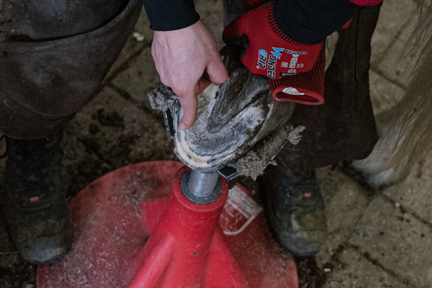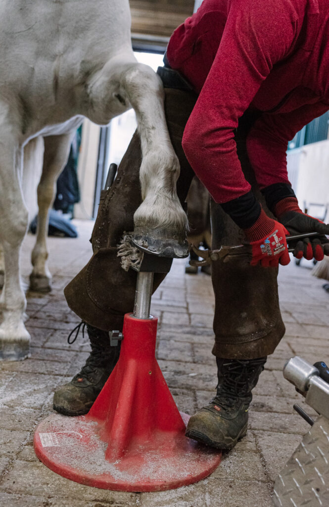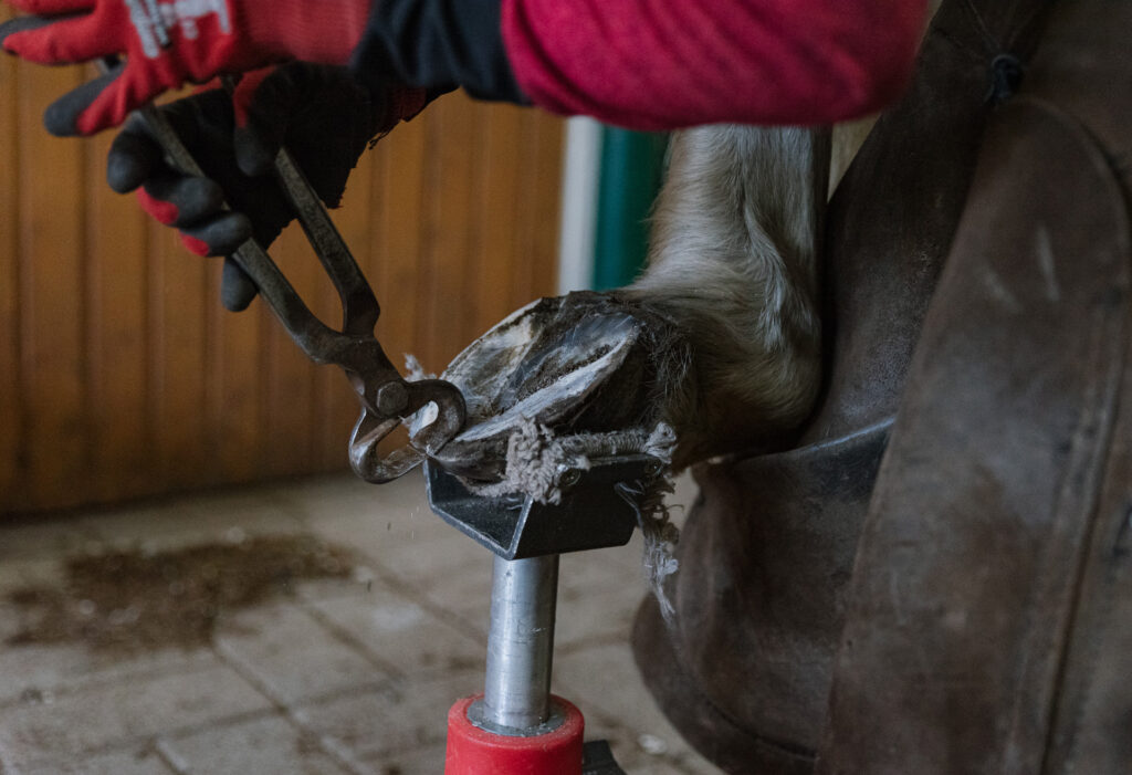 Kengittäjä on työssään jatkuvasti tekemisissä isojen monisatakiloisten pakoeläinten kanssa. Saarivuoren mukaan työturvallisuutta lisäävät turvakengät ja kengityslahkeet tai kengitysessu.